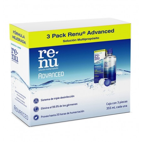 Cuando se usa diariamente, la solución multiuso de fórmula avanzada de renu disuelve las proteínas y limpia, afloja y elimina las acumulaciones de película, residuos y depósitos de las lentes de contacto blandas. La solución multiuso de fórmula avanzada de renu ayuda a prevenir la formación de depósitos irritantes en la superficie de la lente. Mata a los microorganismos dañinos en la lente. La solución multiusos de fórmula avanzada de Renu también se puede usar para enjuagar lentes.
